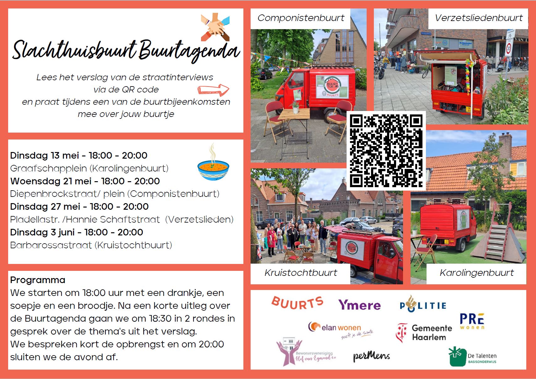 In de zomer van 2024 zijn ruim 250 straatinterviews gehouden in de Slachthuisbuurt. Op 12 woensdagen stond Buurts met de Buurttuk en een bakkie koffie in de wijk. De komende maand organiseert Buurts met haar partners in elk van de 4 buurten een gezellige bijeenkomst om met elkaar door te praten en wordt gekeken wat we verder kunnen ondernemen om samen met de leefbaarheid in de wijk aan de slag te gaan. Komt u ook?