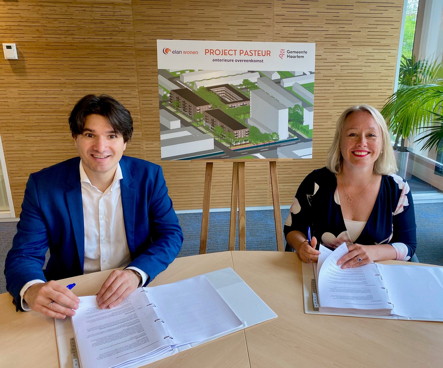 Elan Wonen en de gemeente Haarlem zetten samen een belangrijke stap vooruit in de ontwikkeling van Project Pasteur. Wethouder Floor Roduner van gemeente Haarlem en directeur-bestuurder Marieke Heilbron ondertekenden donderdag 29 juni de anterieure overeenkomst. Dit project betreft de herontwikkeling van de Louis Pasteurstraat en Roordastraat in Haarlem.